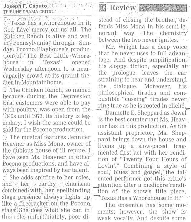 This review of The Best Little Whorehouse in Texas appeared in the Scranton Times Tribune.