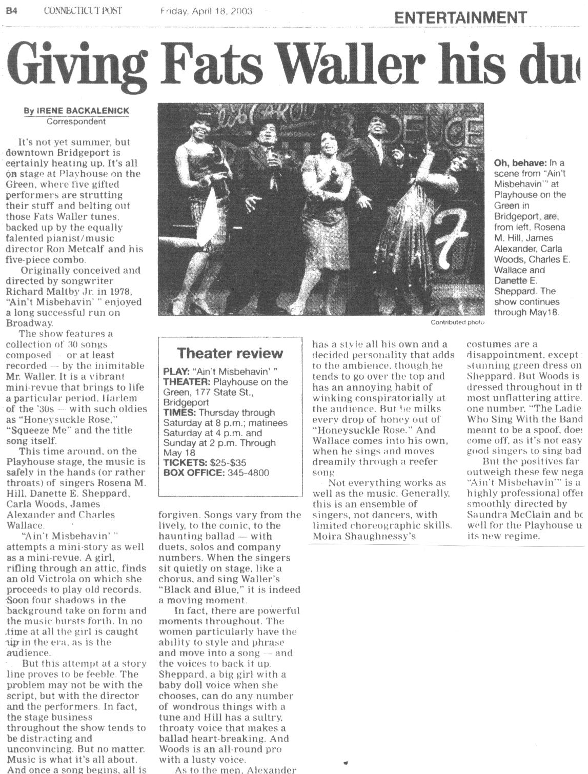 This review of Ain’t Misbehavin’ appeared in the Connecticut Post.
