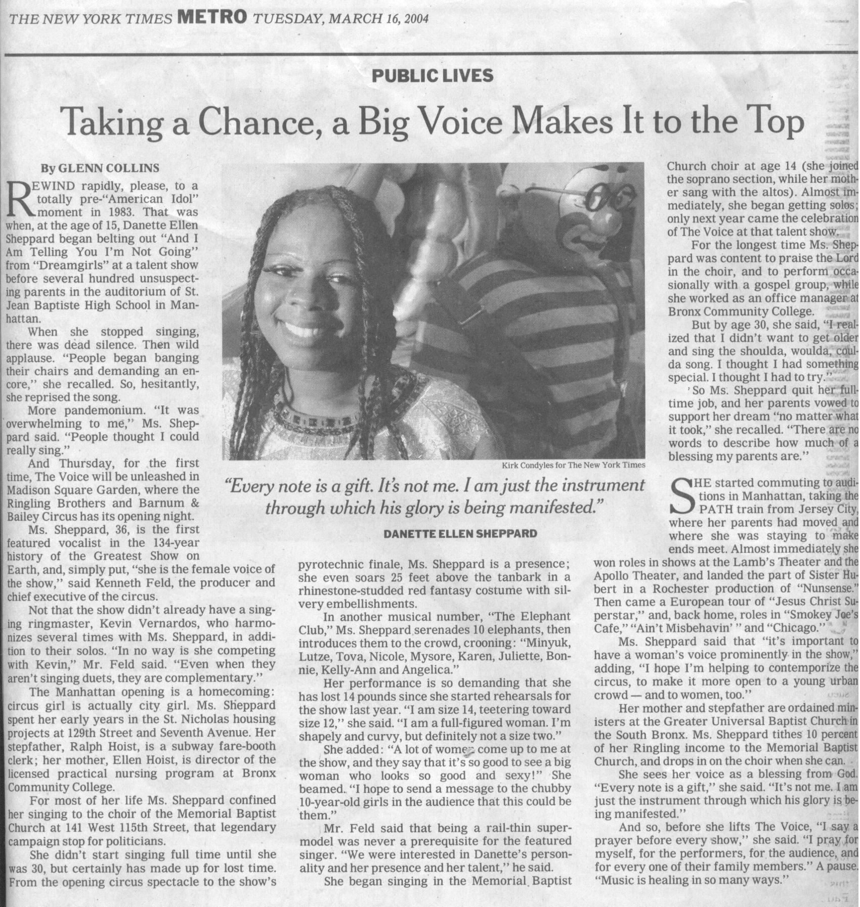 Excerpt: “With a vocal range that dips into bass and soars up to high soprano, [Danette] has what the local theater described as a ‘broad and vivacious gospel voice’… [Danette] carries herself with a quiet but determined presence and a calm that comes from feeling comfortable with one’s place in the world.”